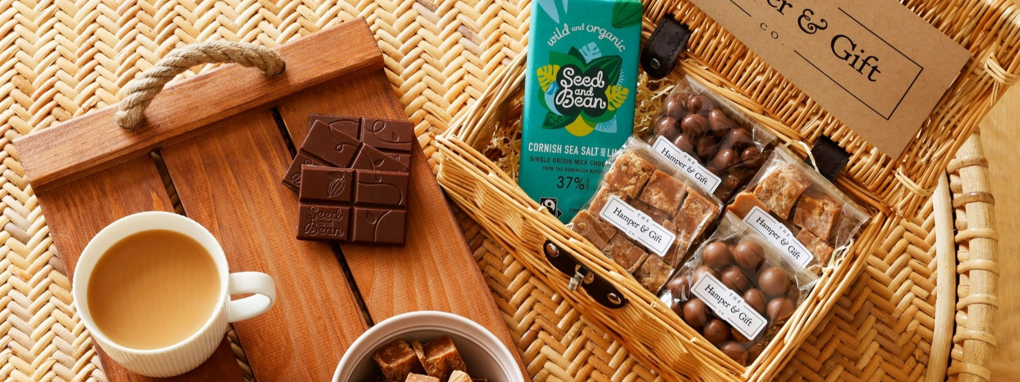 Our wide range of delicious luxury milk chocolate, dark chocolate, fudge, pick & mix sweet and liquorice hampers are proudly hand packed with love in the United Kingdom.